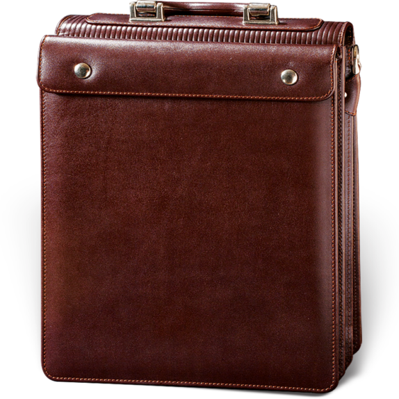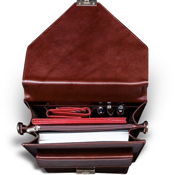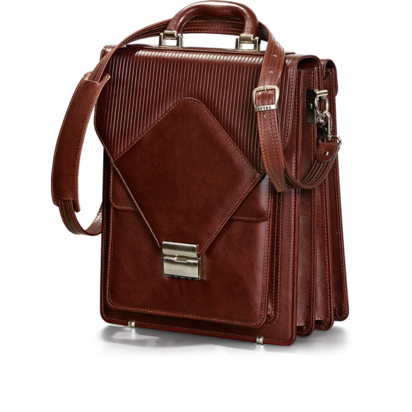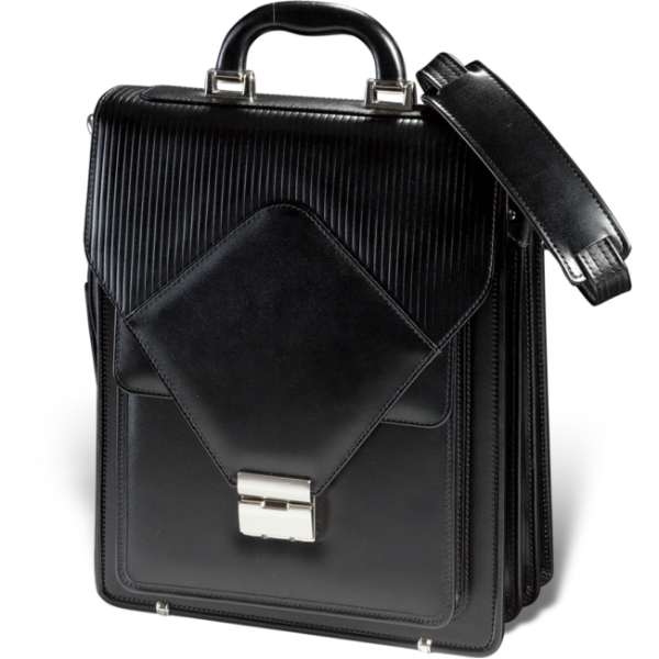 Ova elegantna poslovna muška torba je ručno izrađena od visokokvalitetne goveđe kože, čiji je poklopac postavljen istom. Unutra se nalaze dve pregrade postavljene svilom i obrubljene kožom, predviđene za dokumentaciju A4 (fascikle, spisi, i sl.), kao i za priručni laptop računar, podeljene velikom pregradom sa rajsferšlusom. U prvoj pregradi je i džep za mobilni telefon, novčanik, i tri kožna držača za olovke. Ispod poklopca se nalazi i jedan prostran džep sa dodatnim poklopcem, a sama torba se zatvara šifrovanom niklovanom bravicom. Na poleđini torbe nalazi se dodatni prošireni džep koji se zatvara driherima, koji ovoj torbi daje još dodatnog prostora za potrebna dokumenta. Uz nju dolazi i kožni kaiš za rame podesive dužine koji se kači sa strana torbe, pa se može nositi preko ramena, ili kao ručna torba, s obzirom na jaku kožnu ručku koja se nalazi sa gornje strane torbe. Predviđena je za poslovne ljude koji žele da imaju svu dokumentaciju na jednom mestu. Izrađuje se u crnoj i braon boji, i dolazi upakovana u tkanoj vrećici. Na sam artikal se može utiskivati logo naručioca.