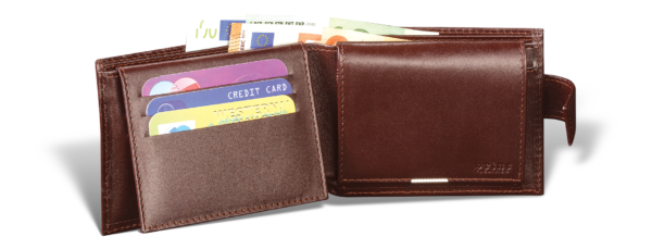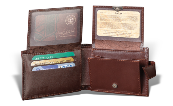 Ovaj artikal je ručno izrađen od visokokvalitetne goveđe kože, sa svilenom postavom. Glavna pregrada novčanika je podeljena na dva dela za papirni novac. Sa leve strane nalaze se pregrade za 3 kartice, na čijem poklopcu je sa unutrašnje strane prozorčić od PVC plastike, a sa spoljne deo za još 3 kartice. Sa desne strane novčanika nalazi se džep za sitninu, na čijem poklopcu je sa unutrašnje strane takođe prozorčić od PVC plastike. Novčanik ima dva skrivena džepa sa obe strane za dokumenta. Zatvara se kaiščićem sa driherom. Modernog i praktičnog dizajna, pogodan je za nošenje u džepu i u torbi. Na sam artikal, kao i na luksuznu ambalažu u kojoj dolazi, može se utiskivati logo naručioca.