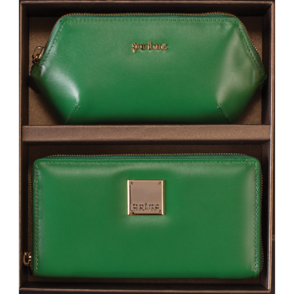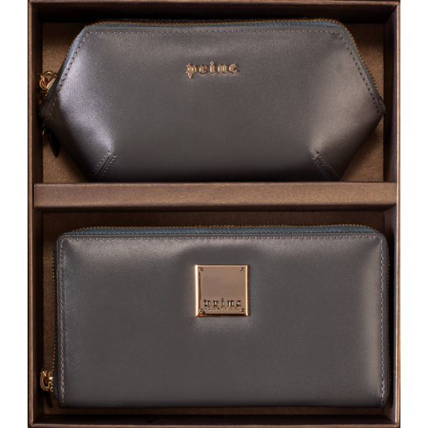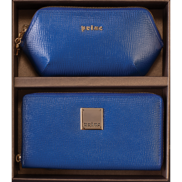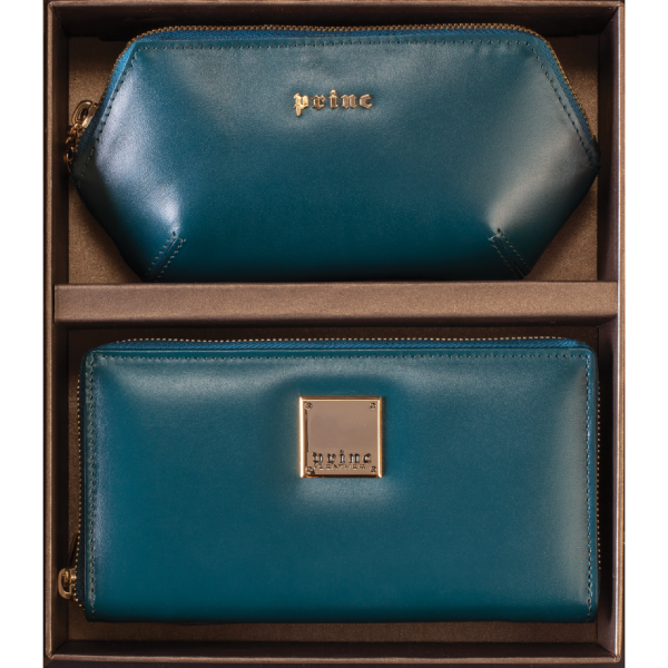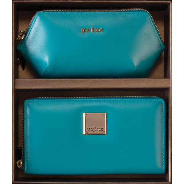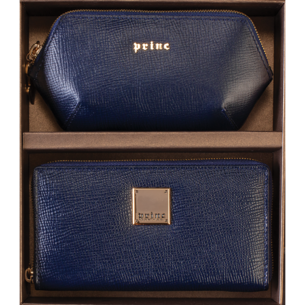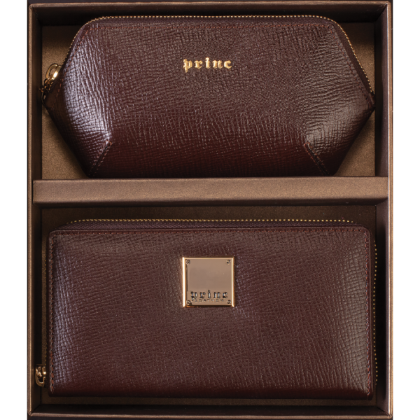 Ovaj poklon set sadrži dva artikla, ručno izrađena od visokokvalitetne goveđe kože, upakovana u luksuznu ambalažu. Elegantni ženski novčanik, zbog svog dizajna može biti zamena i za torbicu, jer u njega staje sve što vam je neophodno. Glavna pregrada novčanika je podeljena na dva dela za papirni novac dugačkim džepom za sitninu sa rajsferšlusom. Sa obe unutrašnje strane nalazi se po 4 pregrade za kartice, ličnu kartu, saobraćajnu i vozačku dozvolu, i sl., iza kojih je po jedan veći džep za dokumenta. Novčanik se sa tri strane zatvara rajsferšlusom sa poliranim metalnim zupcima, iste boje zlata kao i metalna pločica sa logom Princ na prednjoj strani. Neseser koji se nalazi u setu se spolja zatvara rajsferšlusom sa poliranim metalnim zupcima, iste boje zlata kao i metalni logo Princ na prednjoj strani. Unutrašnjost nesesera je slobodna,sa svilenom postavom, predviđena za lakšu organizaciju u torbi, tako da u ovu praktičnu, atraktivnu torbicu možete spakovati kozmetiku, šminku, lekove, naočare, cigarete, novac, i sl. Set se izrađuje u više atraktivnih boja. Na luksuznu ambalažu u koju je set upakovan, može se utiskivati logo naručioca.
